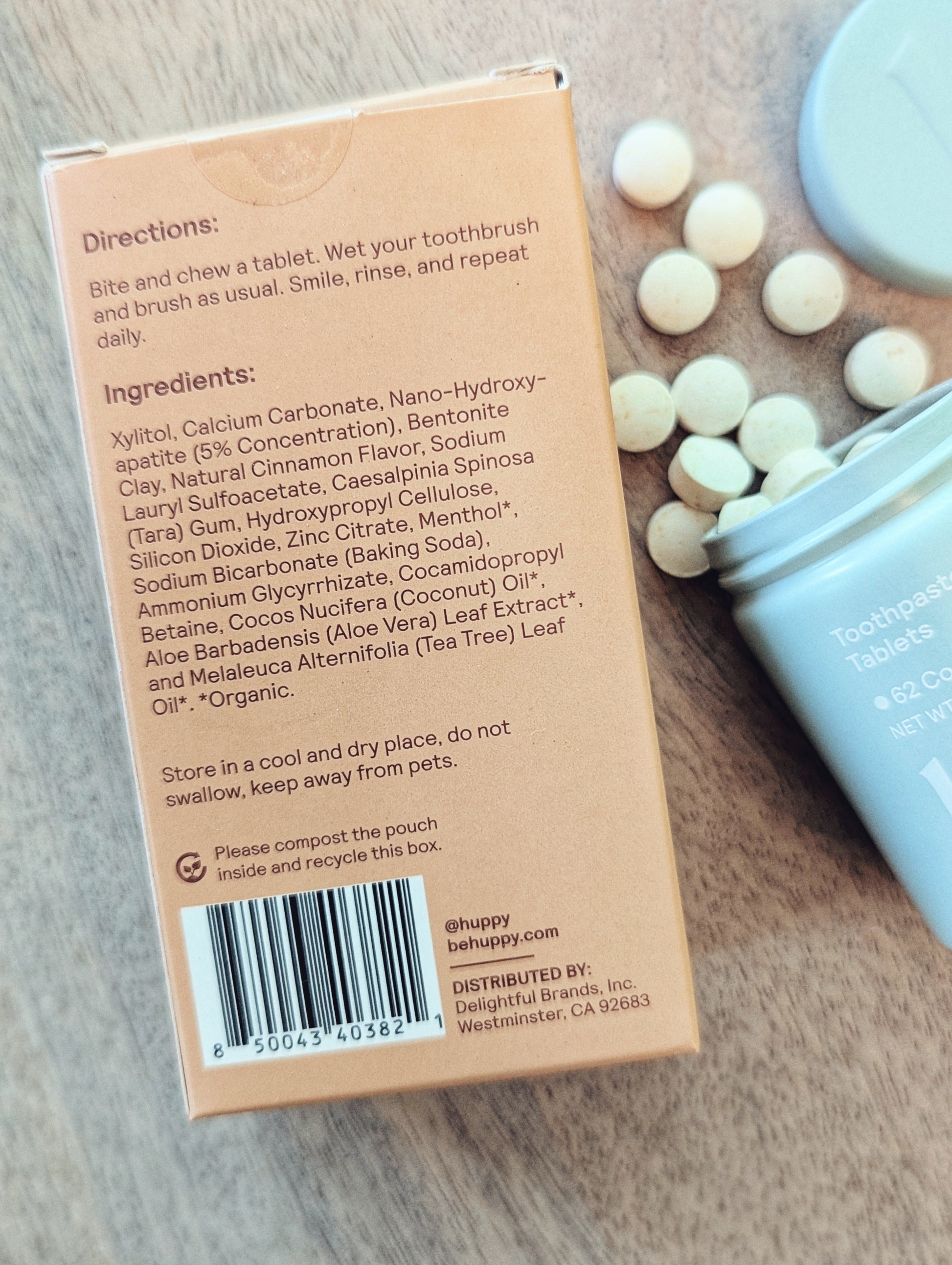 Huppy Toothpaste Tablets are a toothpaste alternative that naturally whitens, fights plaque, and freshens breath without adding more plastic waste to our environment. These tablets are made with clean ingredients like tea tree oil, coconut oil, aloe vera extract, and xylitol, and contain nano-hydroxyapatite, a non-toxic fluoride alternative that remineralizes tooth enamel & helps fight sensitivity.